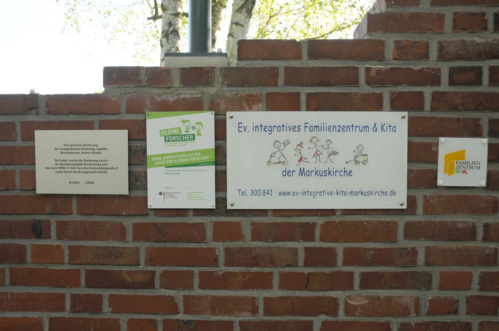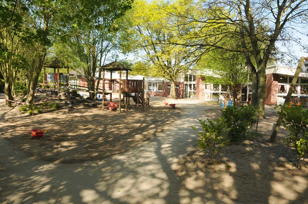 Die Kindertagesstätte liegt ca. 300 m von der Hauptstraße, die durch den Ortskern führt, entfernt. Fischeln ist der südlichste Stadtteil von Krefeld. Das Grundstück liegt eingebunden auf dem Kirchengrundstück und grenzt an die Gärten der anliegenden Einfamilienhäuser. Der kleine geschlängelte Weg zur Kita führt in eine abgeschiedene, grüne Oase.